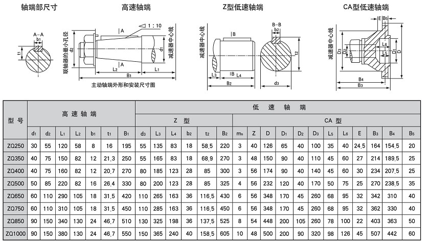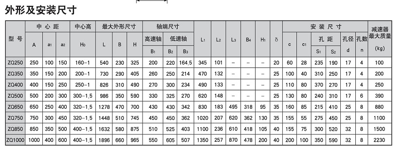 JZQ,ZQ(A)、ZQ(H)系列圓柱齒輪減速機參數(shù)及安裝尺寸: